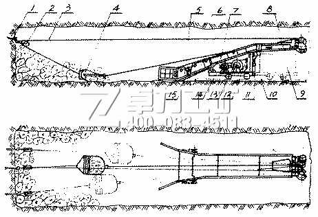 安裝使用示意圖↑1、固定楔 2、尾輪 3、鋼絲繩 4、耙斗 5、簸箕口 6、連接槽 7、中間槽 8、卸載槽 9、礦車 10、軌道