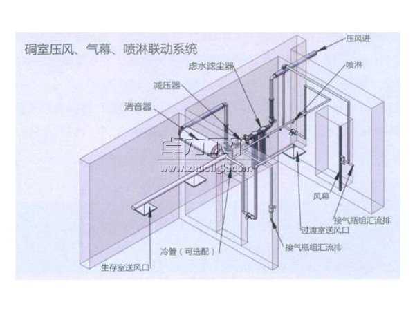 氣幕噴淋系統(tǒng)是煤礦井下避難硐室或救生艙的重要組成部分,是將壓縮空氣通過噴氣氣幕管形成氣幕,在避難硐室防護(hù)密閉門處形成一個相對隔絕的密閉室,過渡室上部的噴淋設(shè)備釋放大量的氣流,單向換氣閥將有毒氣體替換出去,不會隨著避險人員進(jìn)入到生存室內(nèi)。