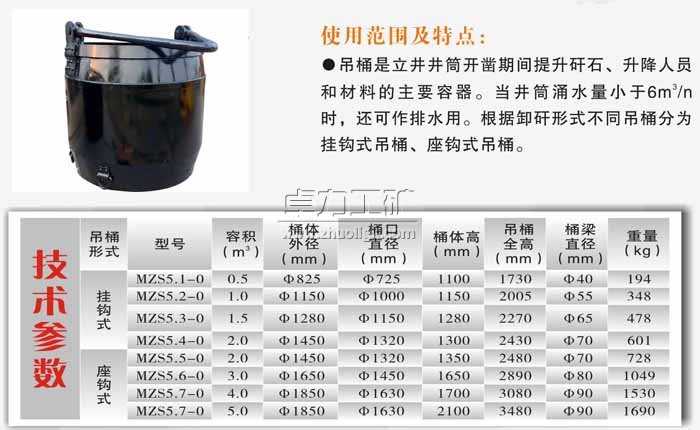 座鉤式吊桶的用途:吊桶是立井井筒開鑿期間提升矸 石、升降人員和材料的主要容器。當井筒涌水量小于6M3/h時,還可作排水用。