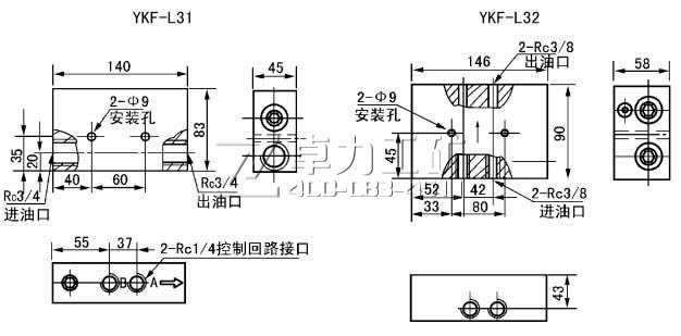 3、YKF-L31型2個與1個YHF-L1型液壓換向閥組合;YKF-L32 型1個與1個YHF-L2型液壓換向閥或YKF-L4型壓力操縱閥組合。