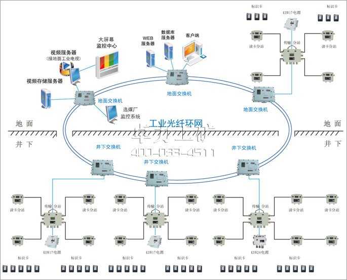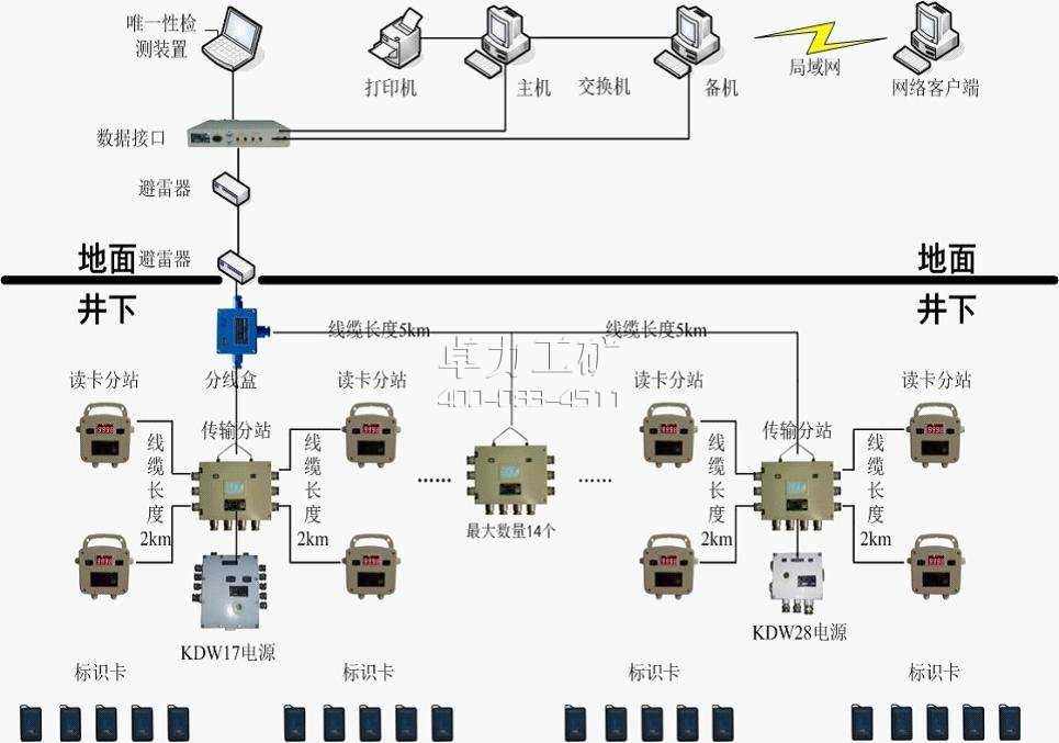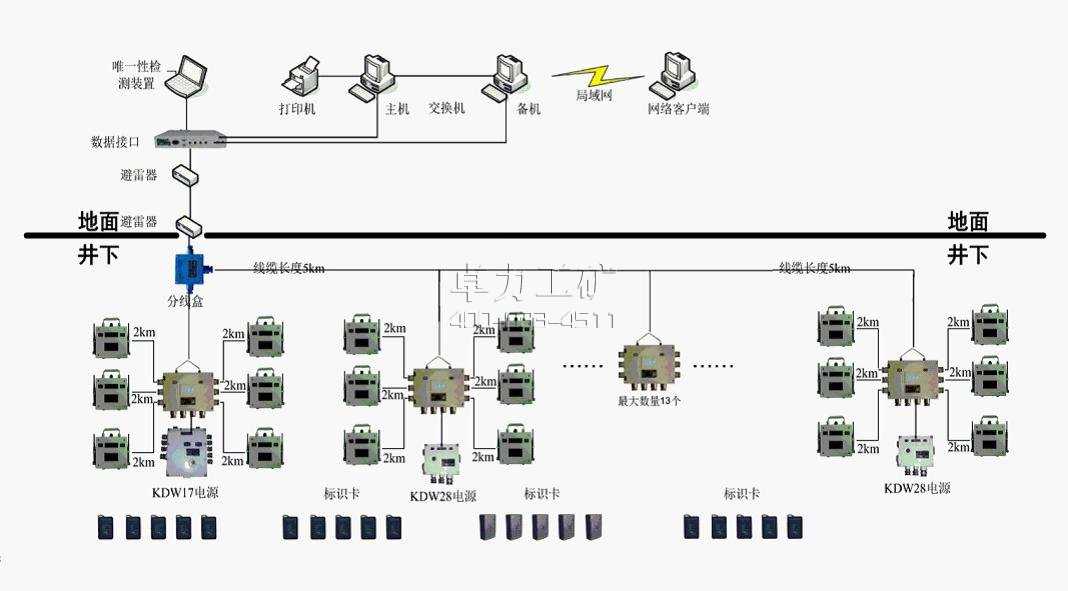 系統采用總線型網絡結構。系統最多可接入16個傳輸分站設備(KJ128A-F型傳輸分站或KJ128A-F(A)礦用本安型傳輸分站);其中KJ128A-F型傳輸分站設備可接入KJ128A-F1讀卡分站1~4個;其中KJ128A-F(A)礦用本安型傳輸分站設備可接入KJ128A-F1(A)礦用本安型讀卡分站1~6個;系統最大可管理標識卡不少于8000;供電電源:KDW17型礦用隔爆兼本安電源;KDW28-18型礦用隔爆兼本安不間斷電源,地面設備使用交流220V供電。
