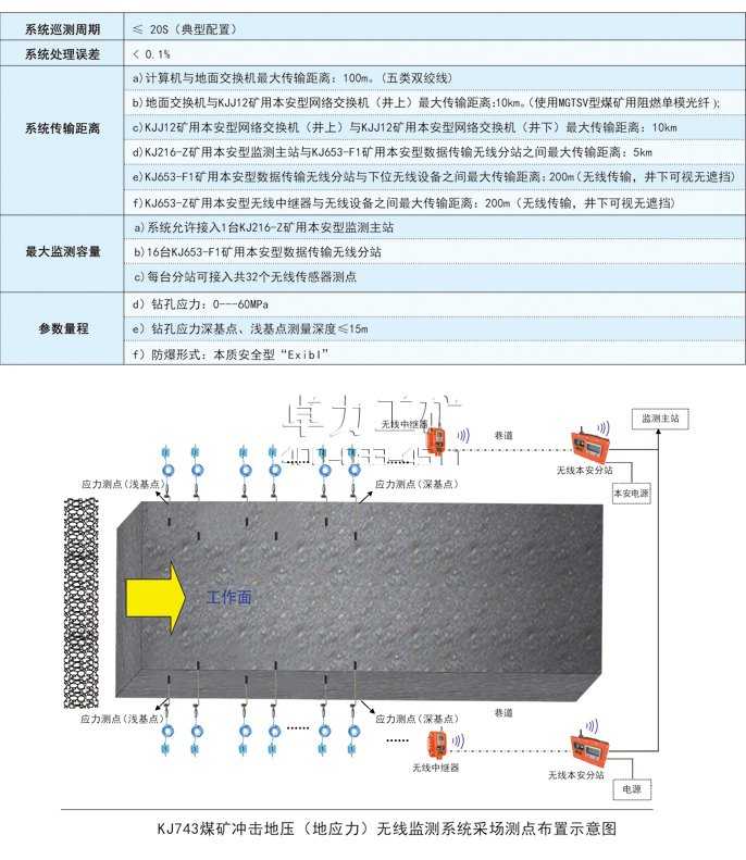 基本功能:KJ743煤礦沖擊地壓(地應(yīng)力)無線監(jiān)測系統(tǒng)是我公司研發(fā)的新一代應(yīng)力型監(jiān)測系統(tǒng),適用于煤礦的礦震、沖擊地壓(巖爆)、煤與瓦斯突出等礦山災(zāi)害的預(yù)警和監(jiān)測。監(jiān)測系統(tǒng)實時無線監(jiān)測工作面和巷道周圍的煤體和巖體的應(yīng)力,并診斷和預(yù)報發(fā)生沖擊地壓及煤與瓦斯突出危險區(qū)域和危險程度,為礦井安全生產(chǎn)提供科學依據(jù)。系統(tǒng)傳感器級采用GFSK無線網(wǎng)絡(luò)技術(shù)進行無線自組網(wǎng)通訊且內(nèi)嵌ulk mesh1.2協(xié)議。各無線傳感器節(jié)點檢測相應(yīng)數(shù)據(jù)信息,然后根據(jù)路由協(xié)議將數(shù)據(jù)傳送給網(wǎng)絡(luò)內(nèi)的無線數(shù)據(jù)傳輸分站。各傳感器節(jié)點之間可以自由通訊。當網(wǎng)絡(luò)內(nèi)部某個無線傳感器節(jié)點出現(xiàn)故障,其他節(jié)點可以進行網(wǎng)絡(luò)自組織,選擇另外的傳輸鏈路,實現(xiàn)網(wǎng)絡(luò)通訊的可靠性。