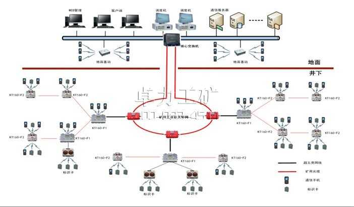 KT160礦用無線通信系統(以下簡稱“KT160系統”),是適用于對煤礦井下和井上的手機進行監控與管理的綜合性系統。該系統通過光纖及網絡交換機完成地面服務器與井下設備的數據交換,通過快速的數據傳輸實現將井下或井上的不同基站下的手機的互聯互通,即可節約資源又方便管理,該系統適用于各類大、中、小型礦井。本系統采用統一標準的工業以太網絡架構,為人員位置監測與管理、數字化視頻監控、各種井下傳感器(例如:瓦斯)數據的統一采集與綜合處理提供了一個共用的網絡平臺,實現語音、視頻、數據的三網合一,為生產調度、應急救援、安全監控與督查提供了科學手段。