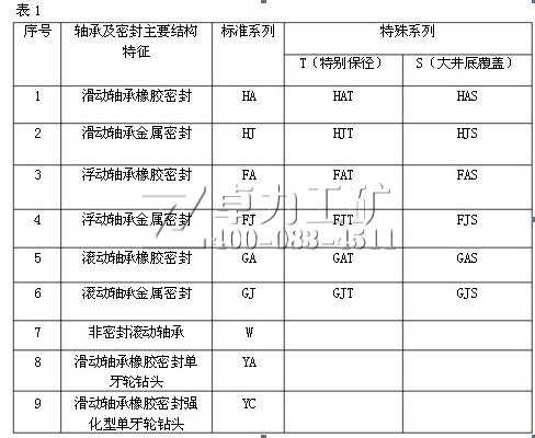 鉆頭系列代號:對于三牙輪鉆頭,按其軸承及密封結構主要特征,分為9個標準系列。除軸承和密封外,鉆產學研結構上比較大的改進作為特殊結構,標準系列與特殊結構或特殊結構的組合組成特殊系列。對于單牙輪鉆頭,鉆頭系列代號以“Y×”表示,“Y”指一個牙輪,“×”為設計編號,代表不同鉆頭設計特征,江漢鉆頭系列代號見下表1.
