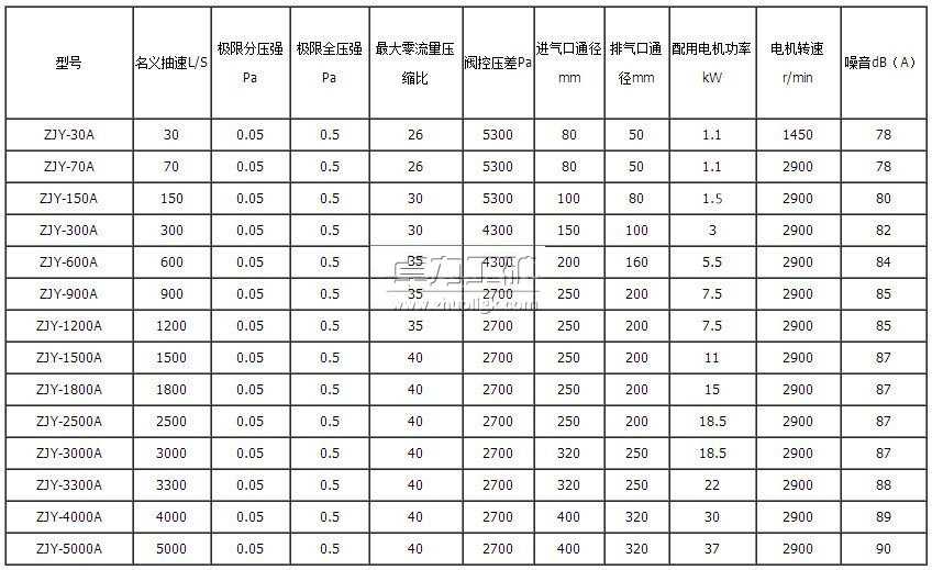三、ZJY系列帶溢流閥羅茨真空泵主要技術性能指標(見下表)