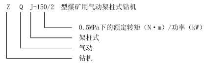 型號示例:ZQJ-150/2 型煤礦用氣動架柱式鉆機:Z 表示鉆機;Q 表示氣動驅(qū)動回轉(zhuǎn)器;J 表示架柱式;150/2 表示在 0.5MPa 氣壓下的額定轉(zhuǎn)矩為 150N·m,此時回轉(zhuǎn)器功率為 2kW。